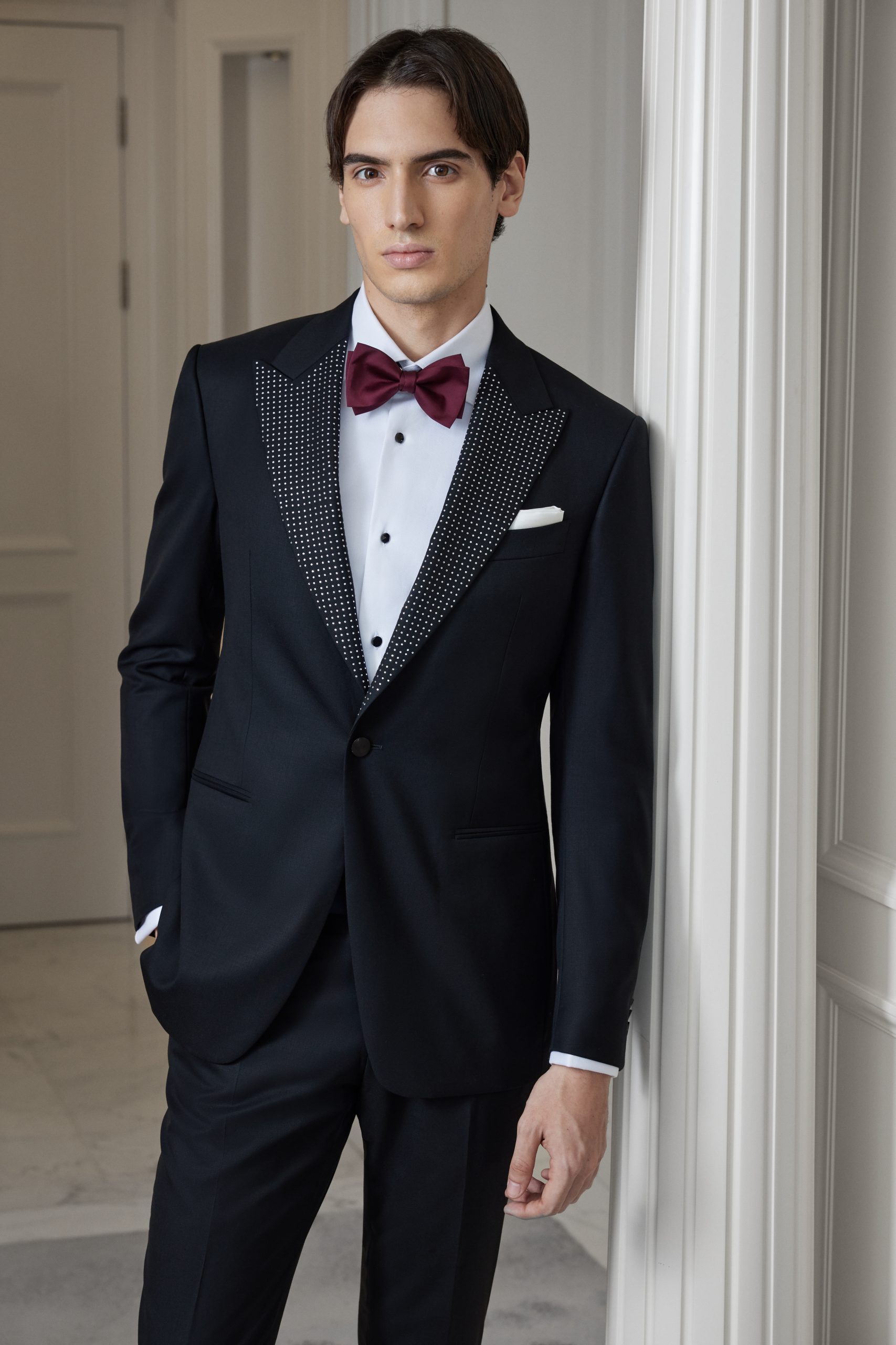 Pure Wool Luxury Eveningwear: Black Tuxedo with Rhinestone Collar in Pure Wool This black tuxedo with rhinestone collar, made from premium pure wool, elevates formal dressing with a bold touch of glamour. Designed for upscale evening events, weddings, and galas, it’s the perfect addition to your formal suit product line. Sophisticated Wool Fabric Meets Statement […]